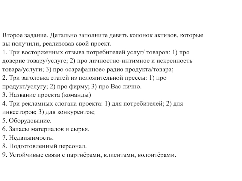 Слайд 90Второе задание. Детально заполните девять колонок активов, которые