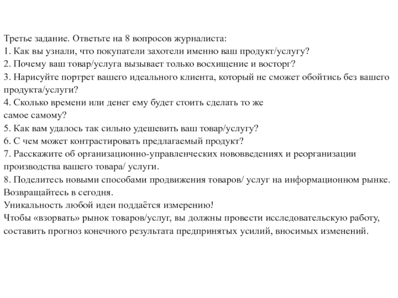 Слайд 91Третье задание. Ответьте на 8 вопросов журналиста:
