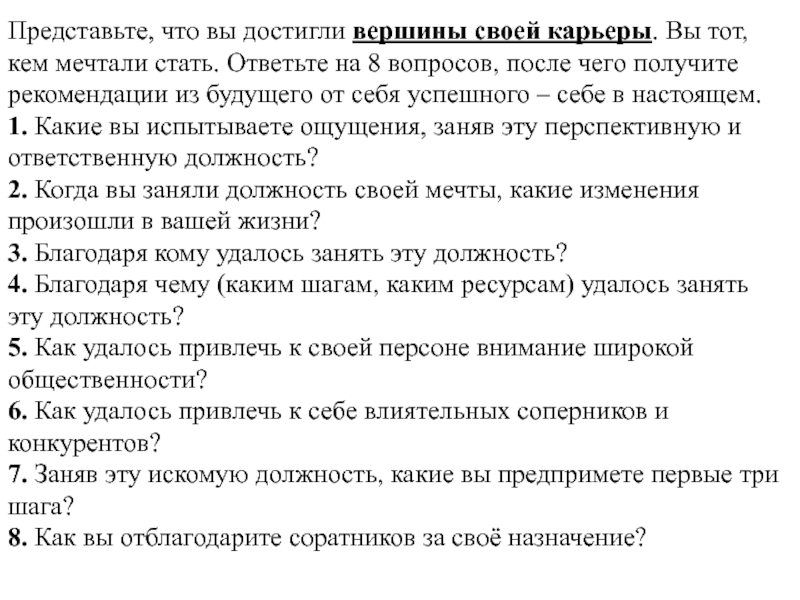 Слайд 85Представьте, что вы достигли вершины своей карьеры. Вы тот, кем