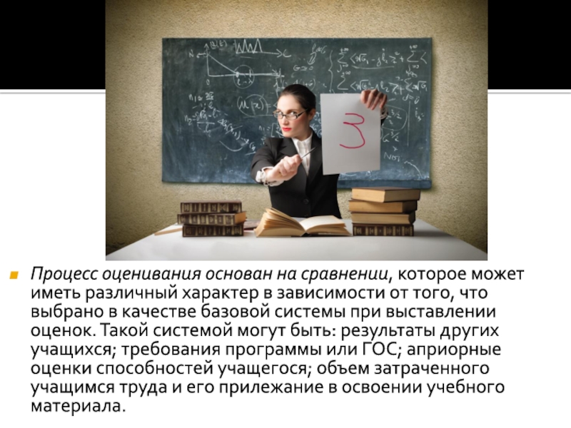 Слайд 6Процесс оценивания основан на сравнении, которое может иметь различный характер