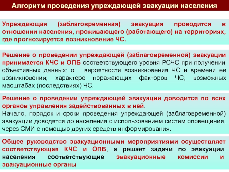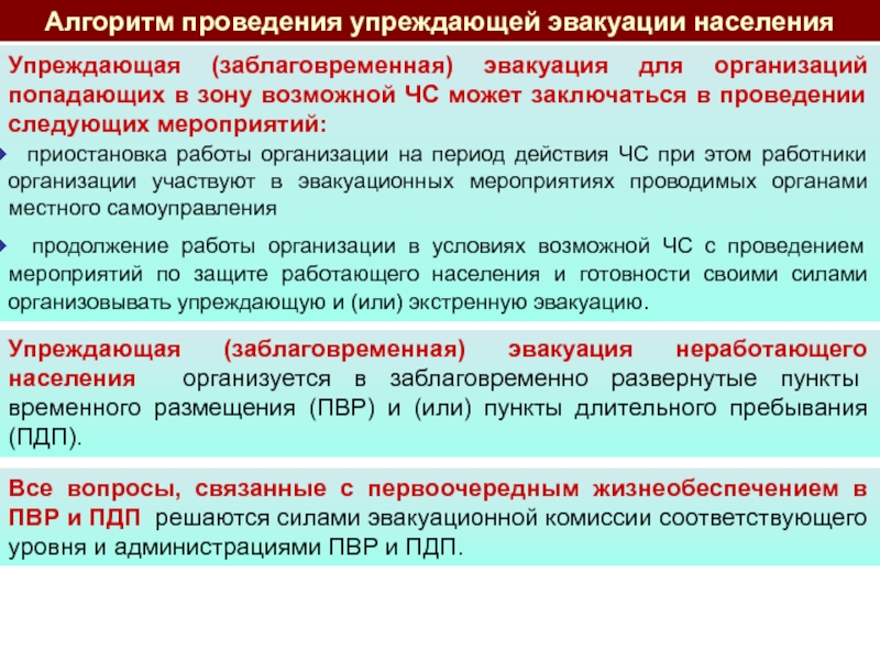 Упреждающая (заблаговременная) эвакуация проводится в отношении населения, проживающего (работающего) на территориях, где прогнозируется возникновение ЧС.