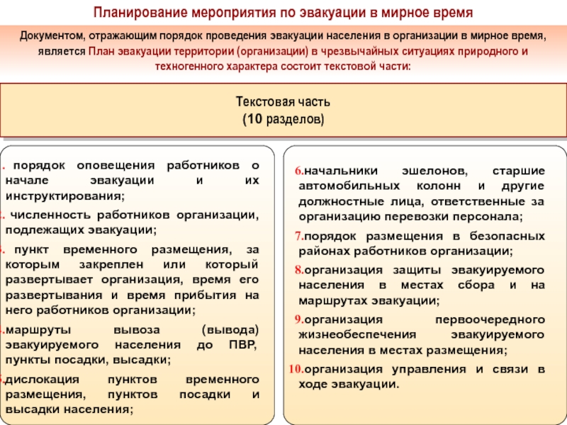 порядок подготовки необходимых документов и грузов к эвакуации, порядок их погрузки разгрузки;