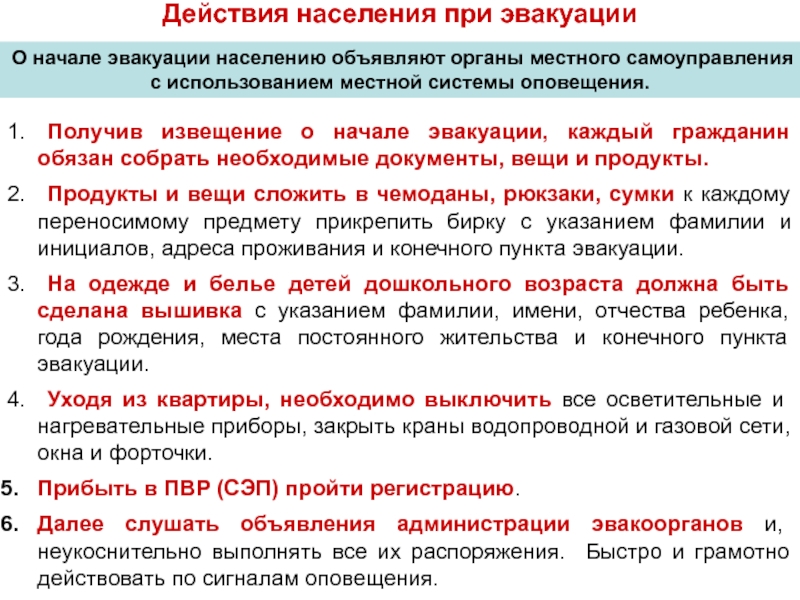 Начало, порядок и сроки проведения упреждающей (заблаговременной) эвакуации доводятся до населения с использованием систем оповещения, через СМИ с помощью других средств информирования.