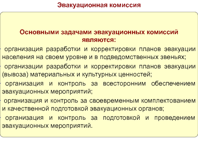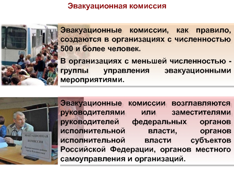 Непосредственное решение задач по эвакуации населения возлагается на эвакуационную комиссию и соответствующие эвакоорганы.