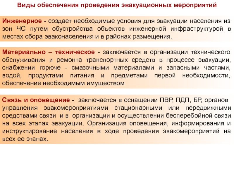 Материально – техническое - заключается в организации технического обслуживания и ремонта транспортных средств в процессе эвакуации, снабжении горюче - смазочными материалами и запасными частями, водой, продуктами питания и предметами первой необходимости, обеспечение необходимым имуществом