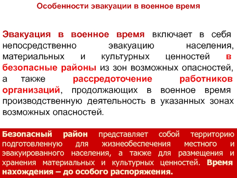 Безопасный район представляет собой территорию подготовленную для жизнеобеспечения местного и эвакуированного населения, а также для размещения и хранения материальных и культурных ценностей. Время нахождения – до особого распоряжения.