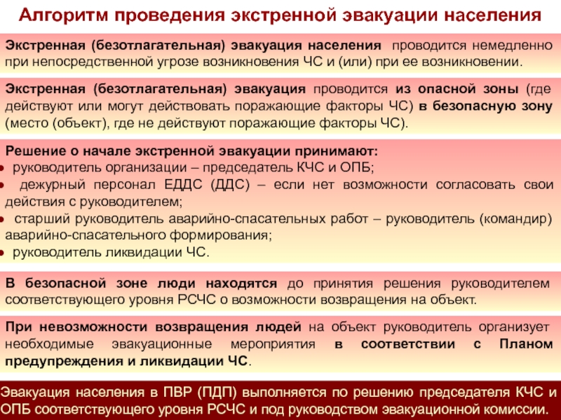 Эвакуация населения в ПВР (ПДП) выполняется по решению председателя КЧС и ОПБ соответствующего уровня РСЧС и под руководством эвакуационной комиссии.