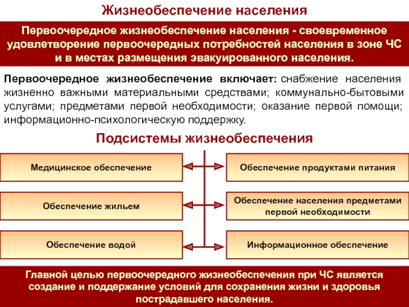 Главной целью первоочередного жизнеобеспечения при ЧС является создание и поддержание условий для сохранения жизни и здоровья пострадавшего населения.
