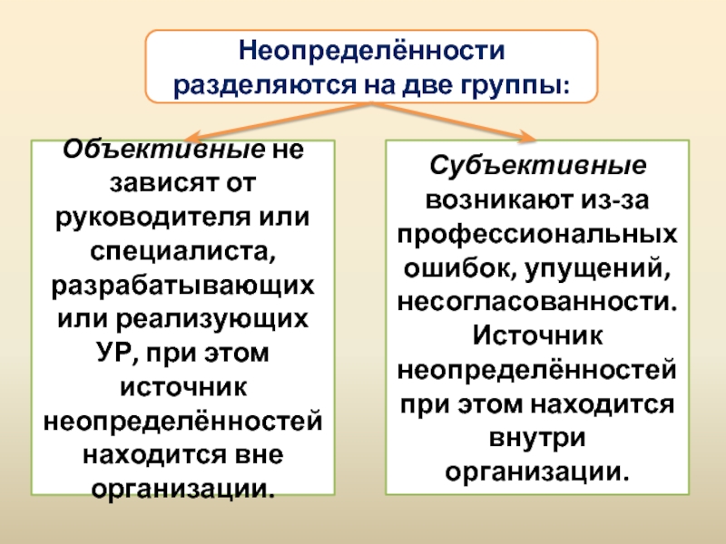 Субъективные возникают из-за профессиональных ошибок, упущений, несогласованности. Источник неопределённостей при этом находится внутри организации.