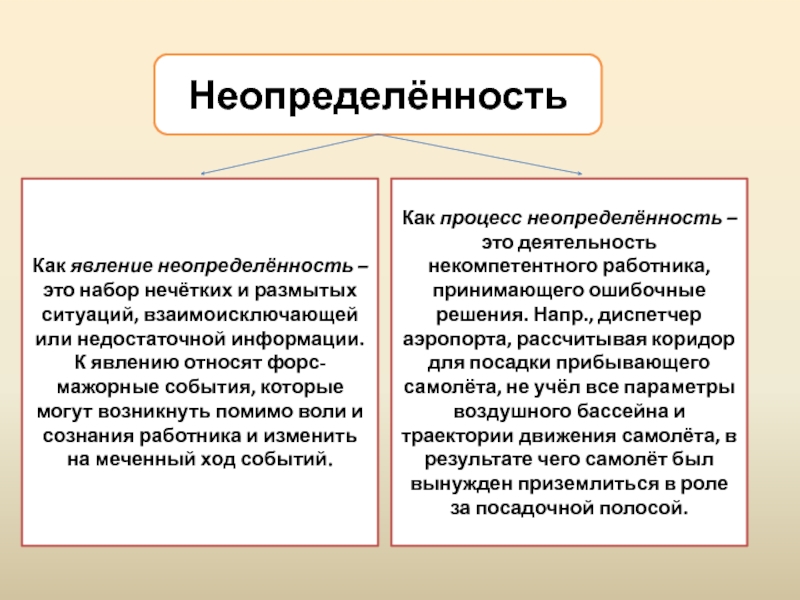 Как процесс неопределённость – это деятельность некомпетентного работника, принимающего ошибочные решения. Напр., диспетчер аэропорта, рассчитывая коридор для посадки прибывающего самолёта, не учёл все параметры воздушного бассейна и траектории движения самолёта, в результате чего самолёт был вынужден приземлиться в роле за посадочной полосой.