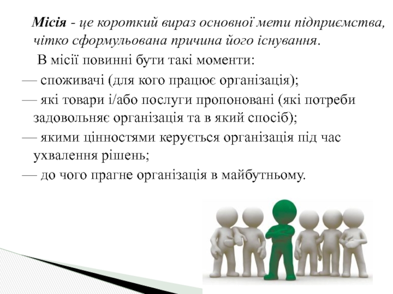 Слайд 8 Місія - це короткий вираз основної мети підприємства, чітко сформульована