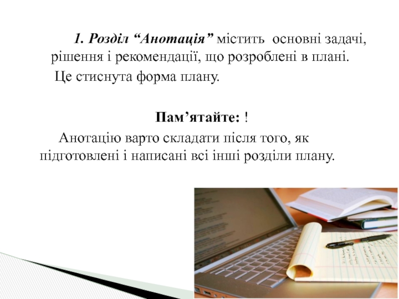 Анотацію варто складати після того, як підготовлені і написані всі інші розділи плану.