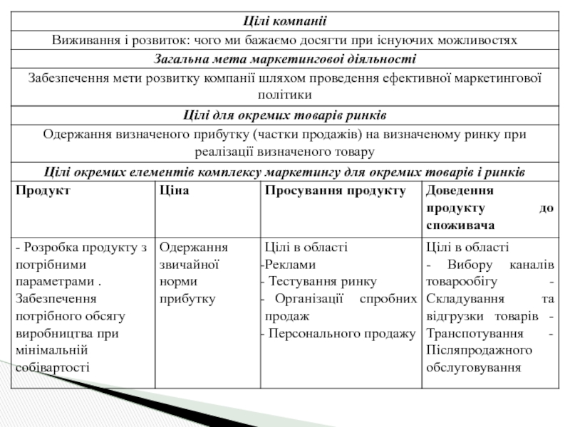 цілі — це конкретні якісні та кількісні зобов'язання підприємства у показниках обсягу продажу, частки