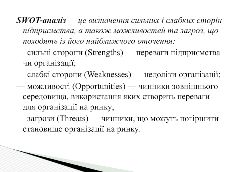 Слайд 9SWOT-аналіз — це визначення сильних і слабких сторін підприємства, а також