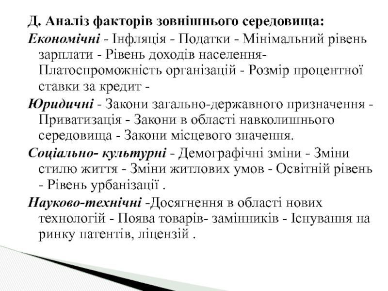 Слайд 15Д. Аналіз факторів зовнішнього середовища: