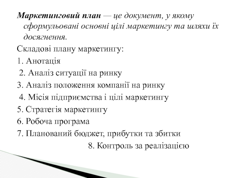 Слайд 12Маркетинговий план — це документ, у якому сформульовані основні цілі маркетингу