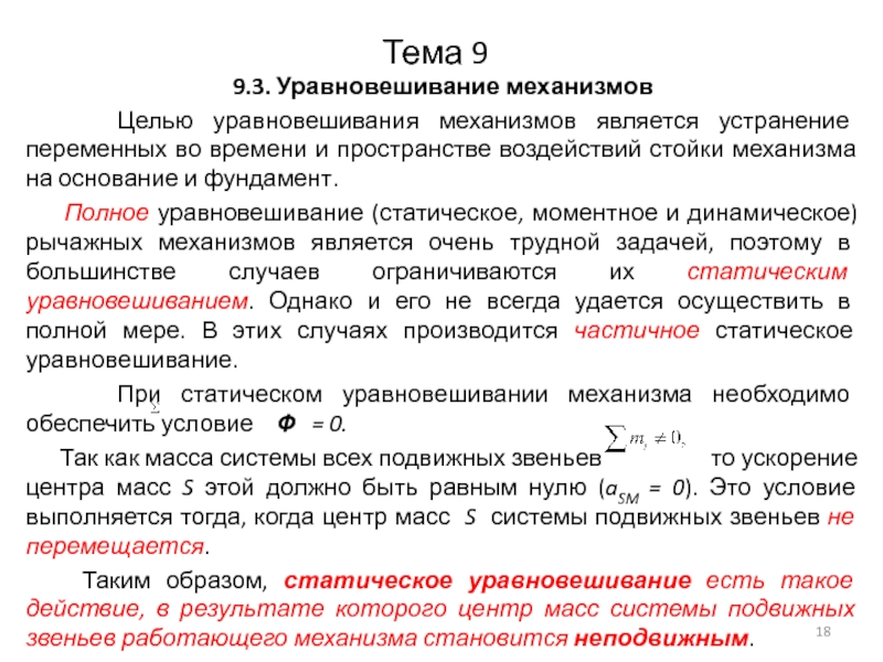 Полное уравновешивание (статическое, моментное и динамическое) рычажных механизмов является очень трудной задачей, поэтому в большинстве случаев ограничиваются их статическим уравновешиванием. Однако и его не всегда удается осуществить в полной мере. В этих случаях производится частичное статическое уравновешивание.
