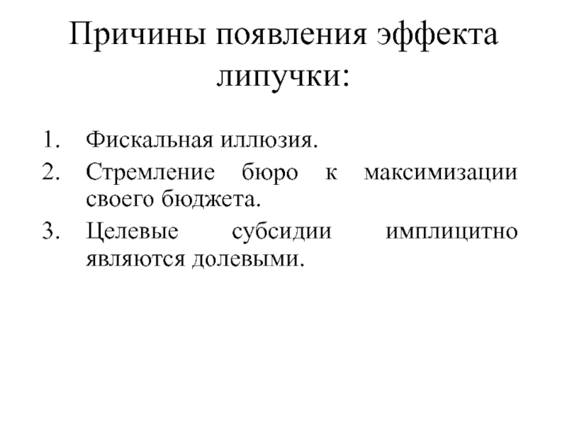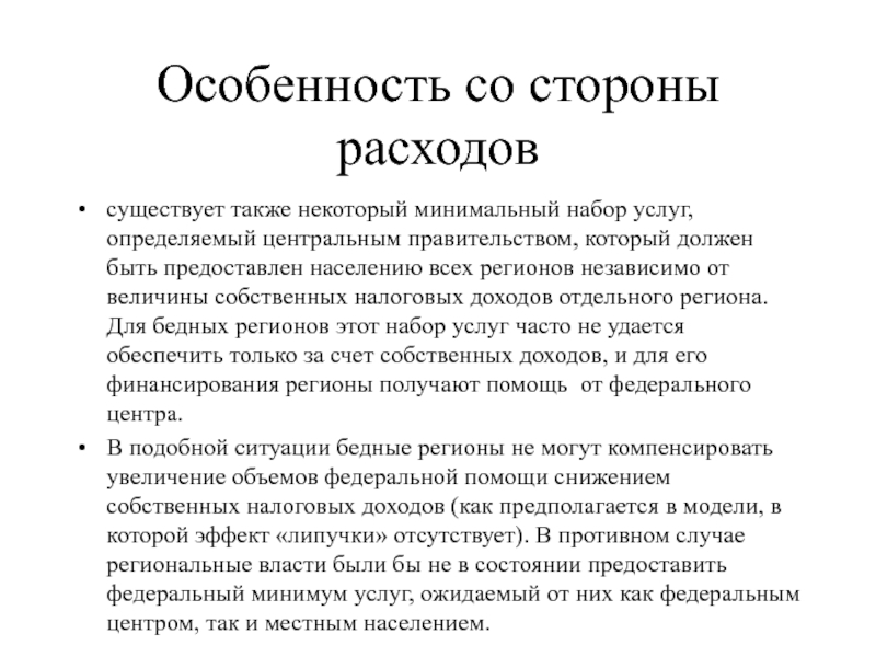 В подобной ситуации бедные регионы не могут компенсировать увеличение объемов федеральной помощи снижением собственных налоговых доходов (как предполагается в модели, в которой эффект «липучки» отсутствует). В противном случае региональные власти были бы не в состоянии предоставить федеральный минимум услуг, ожидаемый от них как федеральным центром, так и местным населением.