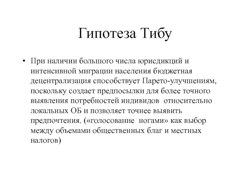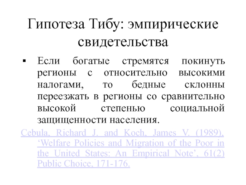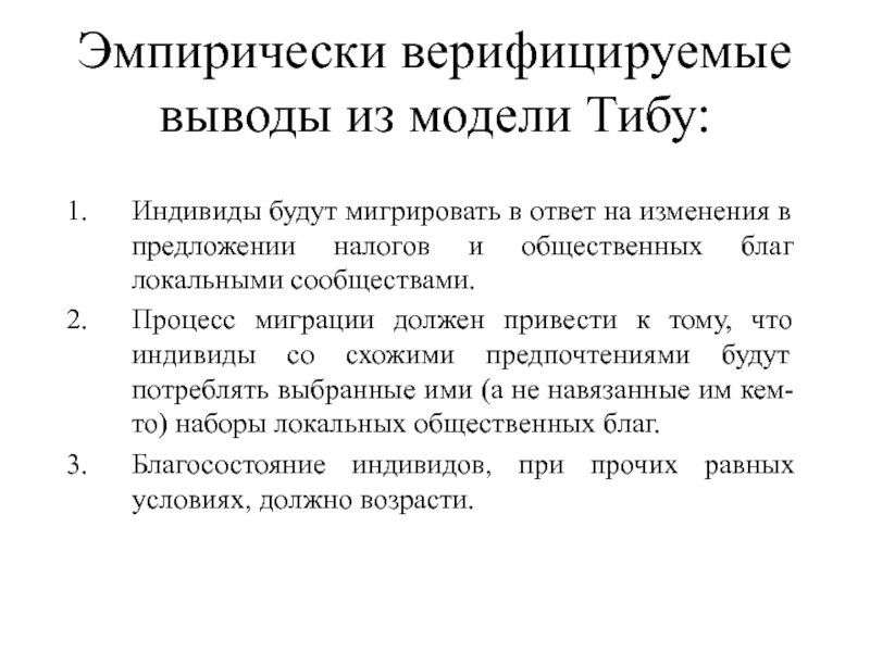Слайд 9Эмпирически верифицируемые выводы из модели Тибу: