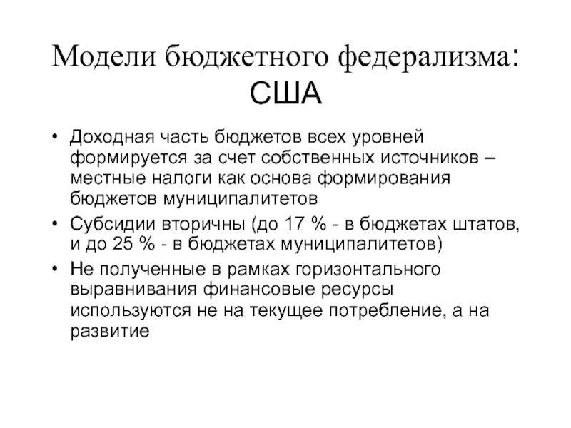 Слайд 17Модели бюджетного федерализма: США