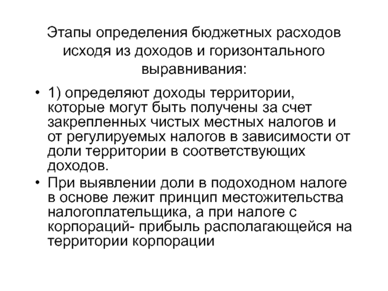 Слайд 30Этапы определения бюджетных расходов исходя из доходов и горизонтального выравнивания: