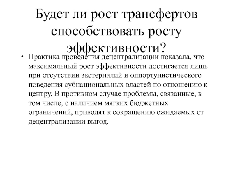 Слайд 27Будет ли рост трансфертов способствовать росту эффективности?