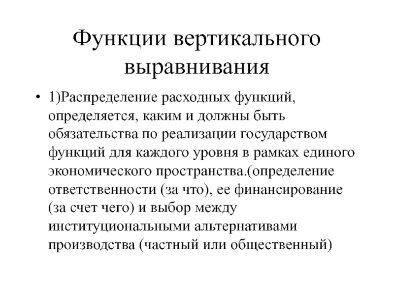 единого экономического пространства.(определение ответственности (за что), ее финансирование (за счет чего) и выбор между институциональными альтернативами производства (частный или общественный)