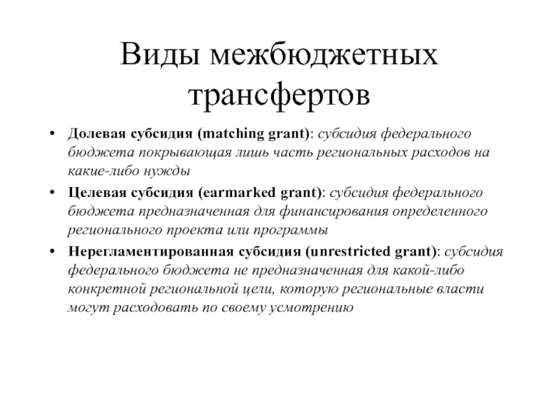 Нерегламентированная субсидия (unrestricted grant): субсидия федерального бюджета не предназначенная для какой-либо конкретной региональной цели, которую региональные власти могут расходовать по своему усмотрению