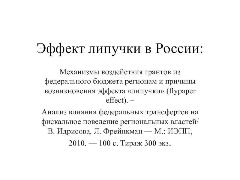 федеральных трансфертов на фискальное поведение региональных властей/ В. Идрисова, Л. Фрейнкман — М.: ИЭПП, 2010. — 100 с. Тираж 300 экз.