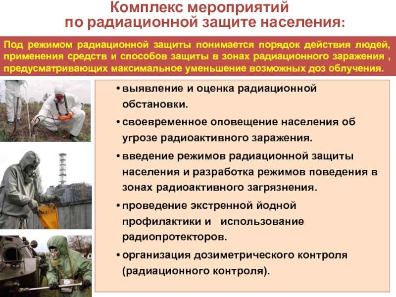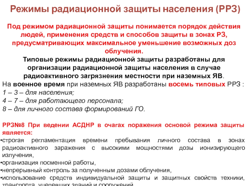 Под режимом радиационной защиты понимается порядок действия людей, применения средств и способов защиты в зонах радиационного заражения , предусматривающих максимальное уменьшение возможных доз облучения.