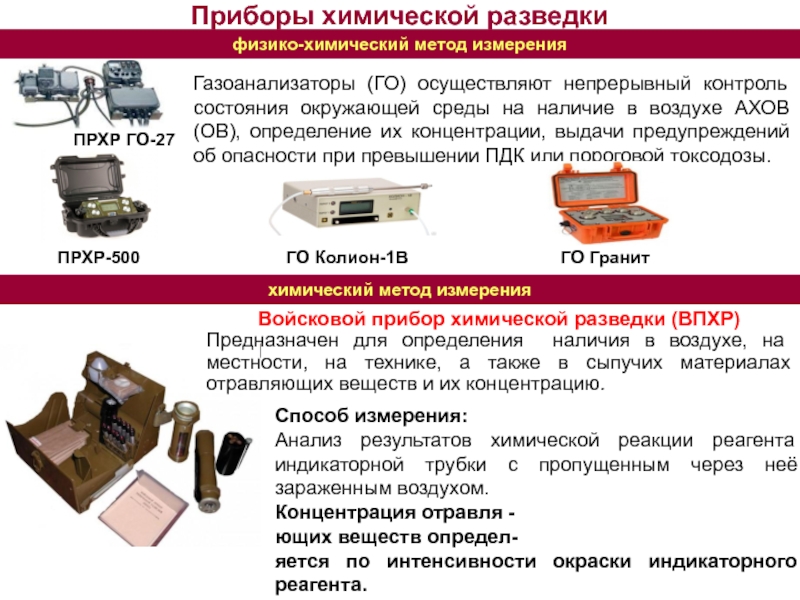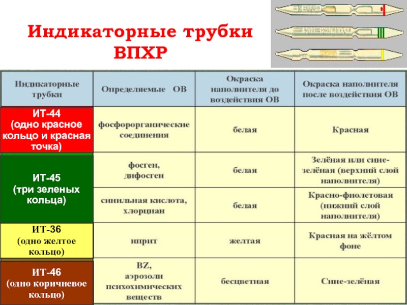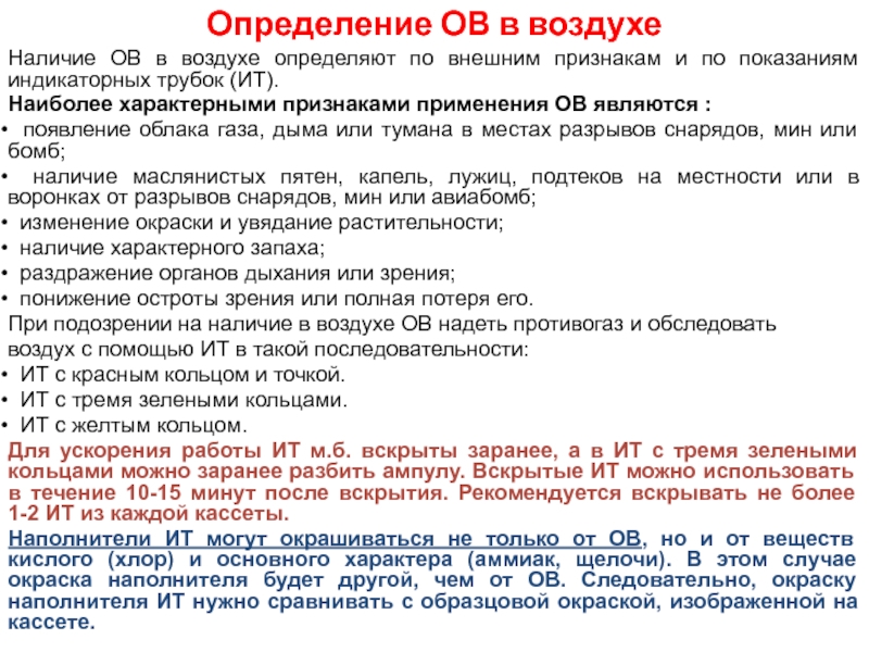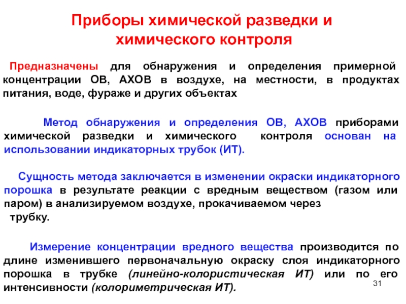 Метод обнаружения и определения ОВ, АХОВ приборами химической разведки и химического контроля основан на использовании индикаторных трубок (ИТ).