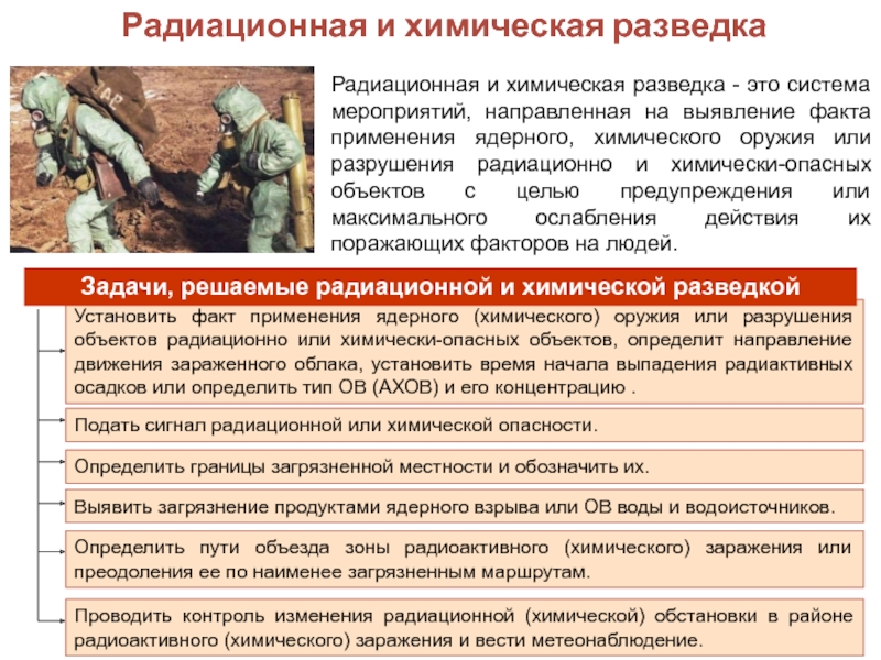 Установить факт применения ядерного (химического) оружия или разрушения объектов радиационно или химически-опасных объектов, определит направление движения зараженного облака, установить время начала выпадения радиактивных осадков или определить тип ОВ (АХОВ) и его концентрацию .