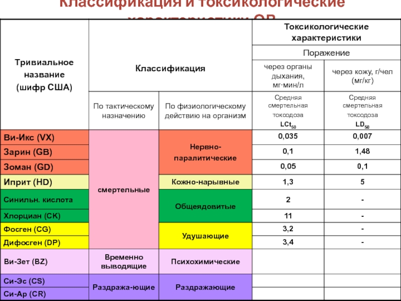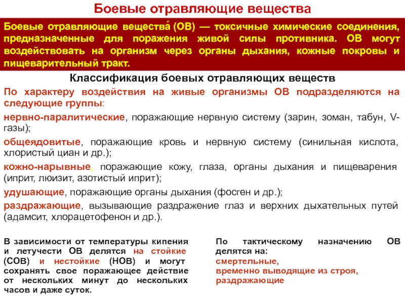 В зависимости от температуры кипения и летучести ОВ делятся на стойкие (СОВ) и нестойкие (НОВ) и могут сохранять свое поражающее действие от нескольких минут до нескольких часов и даже суток.