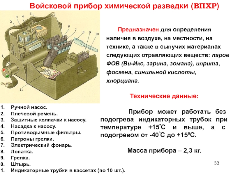 Предназначен для определения наличия в воздухе, на местности, на технике, а также в сыпучих материалах отравляющих веществ и их концентрацию.