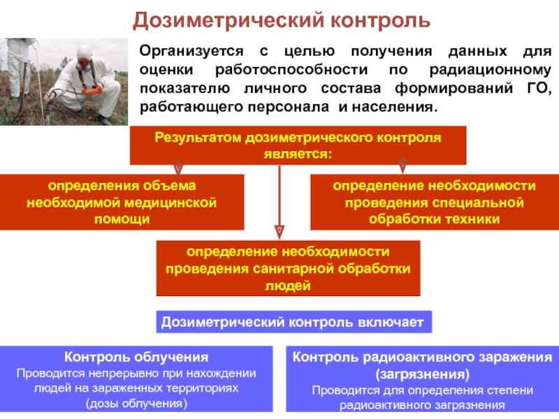 Результатом дозиметрического контроля является: определение необходимости оказания медицинской помощи, объема санитарной обработки людей и специальной обработки техники.