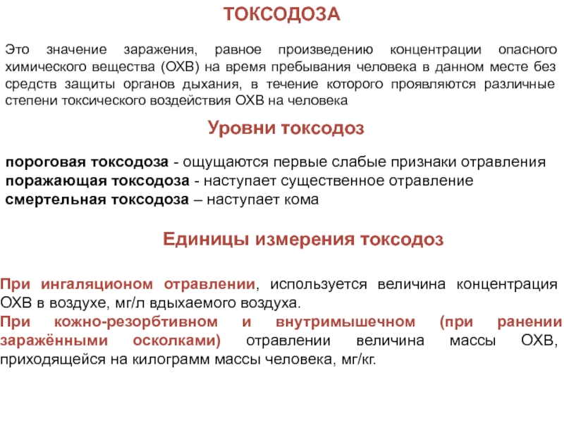 Это значение заражения, равное произведению концентрации опасного химического вещества (ОХВ) на время пребывания человека в данном месте без средств защиты органов дыхания, в течение которого проявляются различные степени токсического воздействия ОХВ на человека