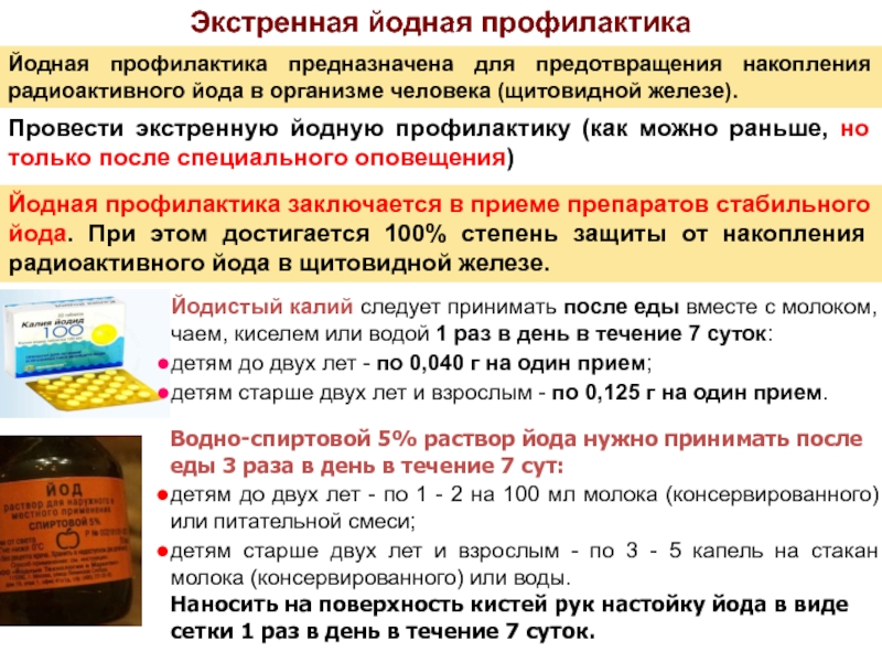 Йодная профилактика заключается в приеме препаратов стабильного йода. При этом достигается 100% степень защиты от накопления радиоактивного йода в щитовидной железе.