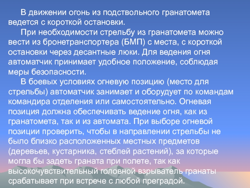 до нее, характера местности, автоматчик может вести стрельбу из гранатомета