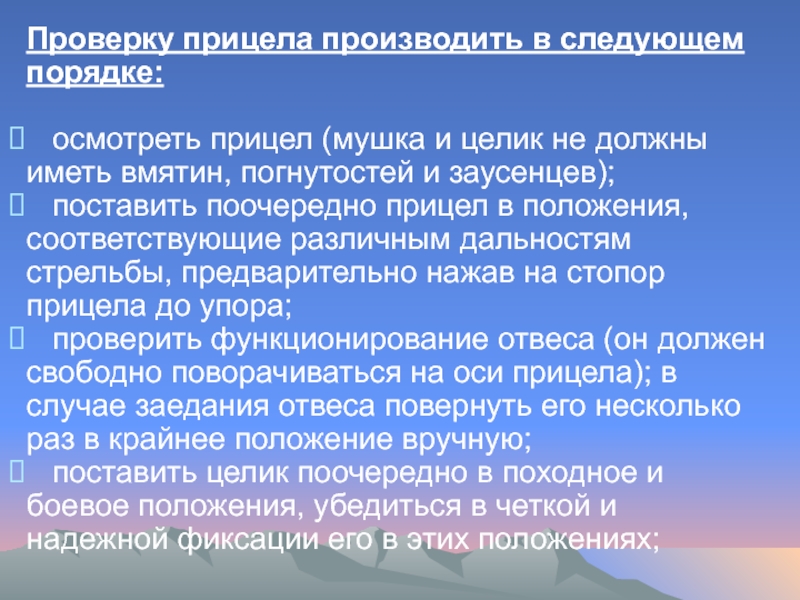 поставить целик поочередно в походное и боевое положения, убедиться в четкой и надежной фиксации его в этих положениях;