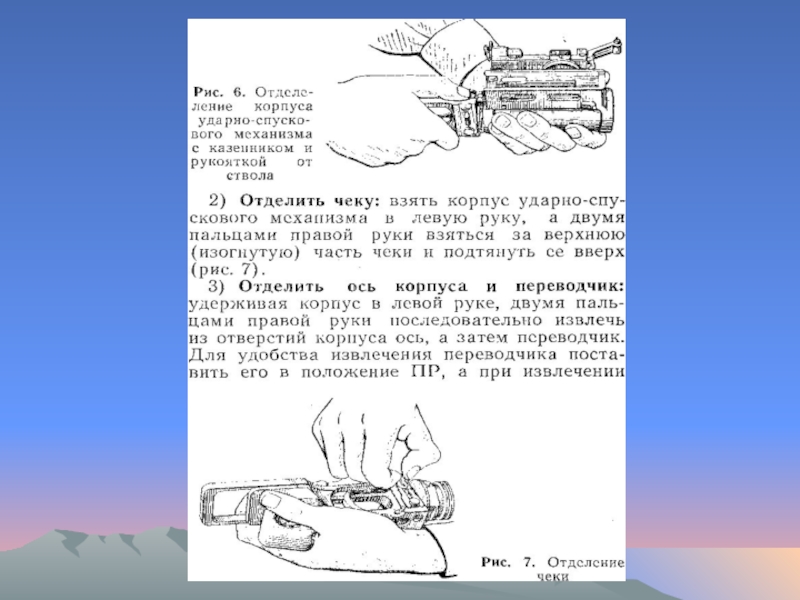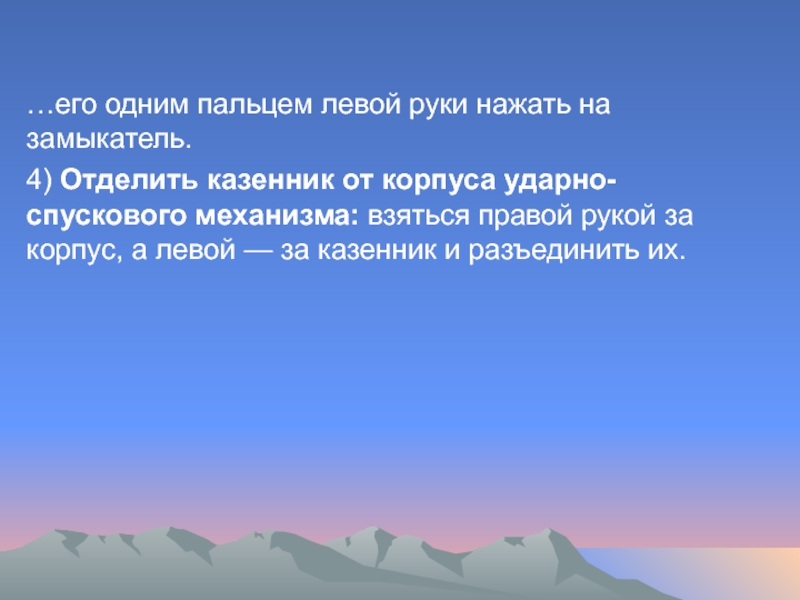 правой — за корпус ударно-спускового механизма и, нажимая большим пальцем правой руки на замыкатель, повернуть ствол с кронштейном относительно корпуса ударно-спускового механизма на 60° в любую сторону, после чего разъединить их.