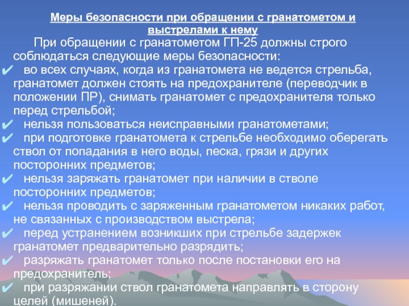 обращении с гранатометом ГП-25 должны строго соблюдаться следующие меры безопасности: