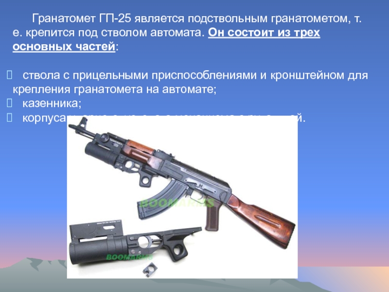 Слайд 6 Гранатомет ГП-25 является подствольным гранатометом, т. е. крепится под стволом