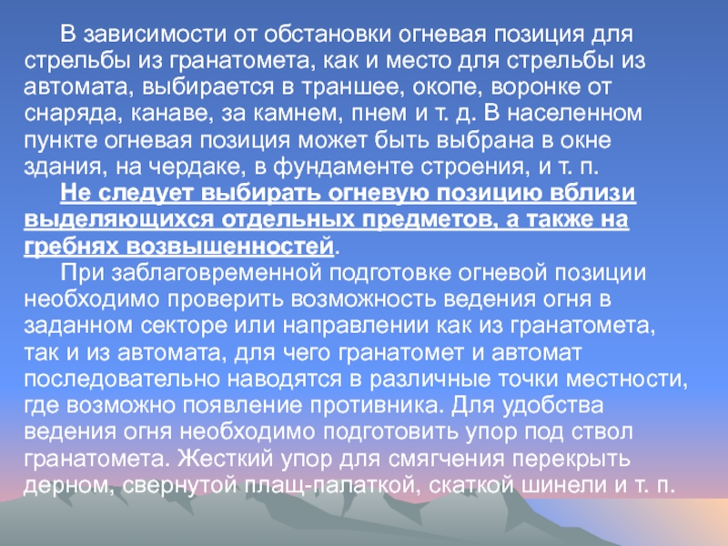 Слайд 32 В зависимости от обстановки огневая позиция для стрельбы из гранатомета,