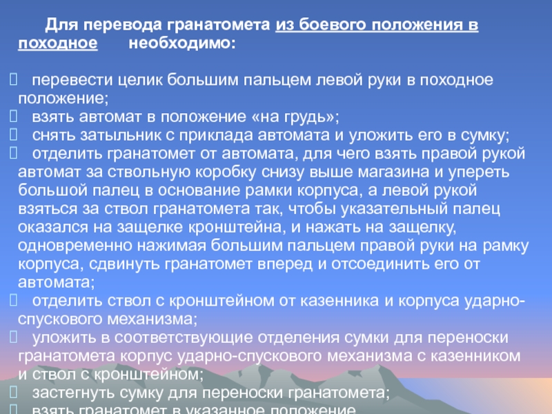 Слайд 22 Для перевода гранатомета из боевого положения в походное необходимо: