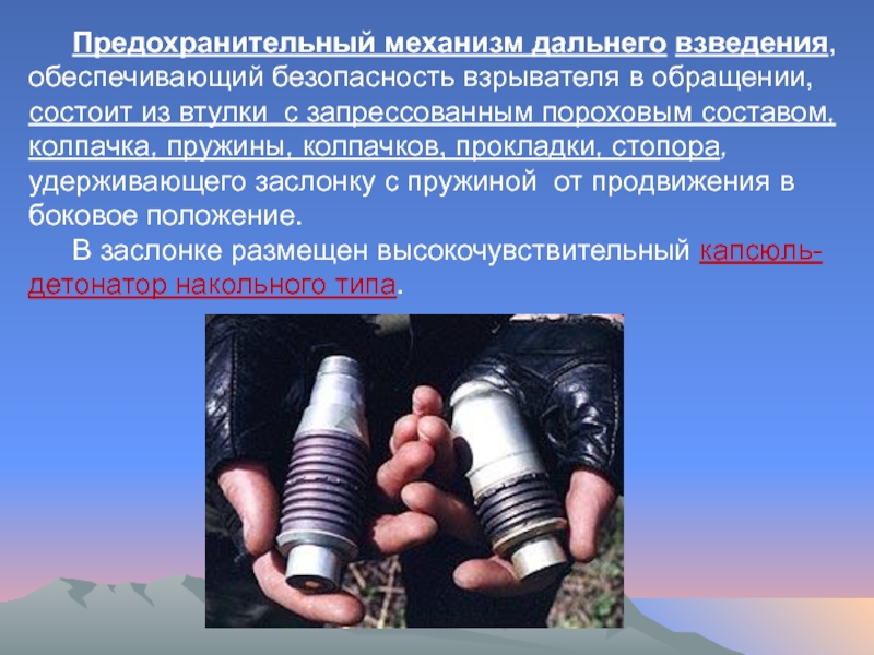 Слайд 16 Предохранительный механизм дальнего взведения, обеспечивающий безопасность взрывателя в обращении, состоит