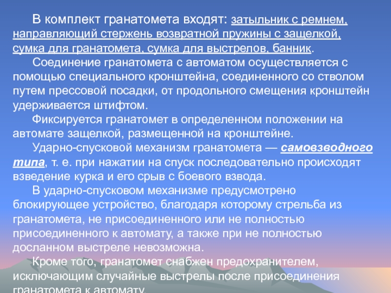 автомата, поэтому автоматчик, вооруженный автоматом с подствольным гранатометом, всегда должен быть готов к ведению огня, как из гранатомета, так и из автомата.