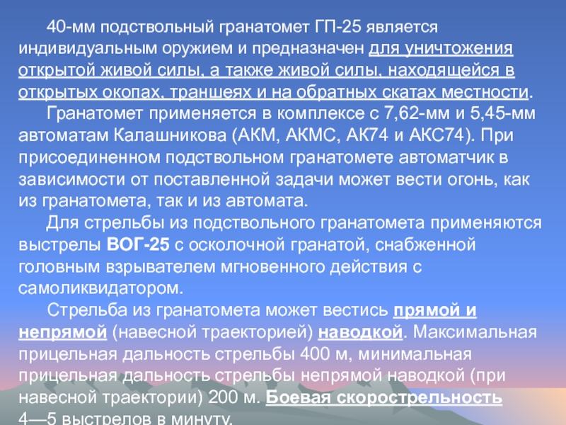 Слайд 4 40-мм подствольный гранатомет ГП-25 является индивидуальным оружием и предназначен для