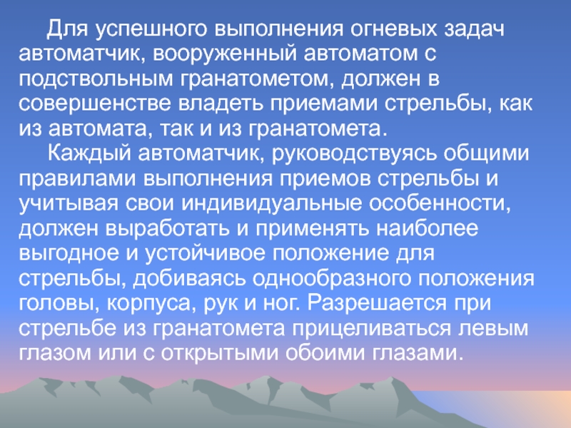 Каждый автоматчик, руководствуясь общими правилами выполнения приемов стрельбы и учитывая свои индивидуальные особенности, должен выработать и применять наиболее выгодное и устойчивое положение для стрельбы, добиваясь однообразного положения головы, корпуса, рук и ног. Разрешается при стрельбе из гранатомета прицеливаться левым глазом или с открытыми обоими глазами.