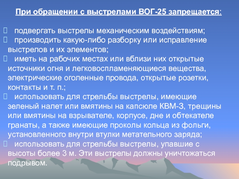Слайд 39При обращении с выстрелами ВОГ-25 запрещается:
