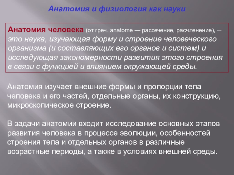 В задачи анатомии входит исследование основных этапов развития человека в процессе эволюции, особенностей строения тела и отдельных органов в различные возрастные периоды, а также в условиях внешней среды.